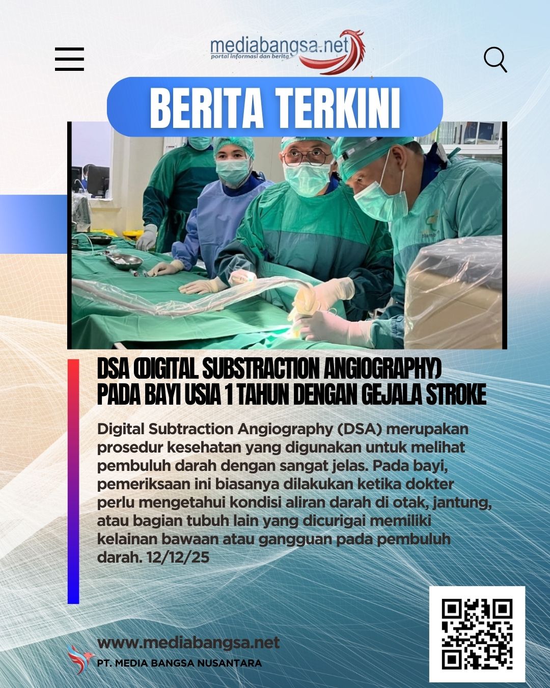Banyuwangi.mediabangsa.net// Digital Subtraction Angiography (DSA) merupakan prosedur kesehatan yang digunakan untuk melihat pembuluh darah dengan sangat jelas. Pada bayi, pemeriksaan ini biasanya dilakukan ketika dokter perlu mengetahui kondisi aliran darah di otak, jantung, atau bagian tubuh lain yang dicurigai memiliki kelainan bawaan atau gangguan pada pembuluh darah. 12/12/25