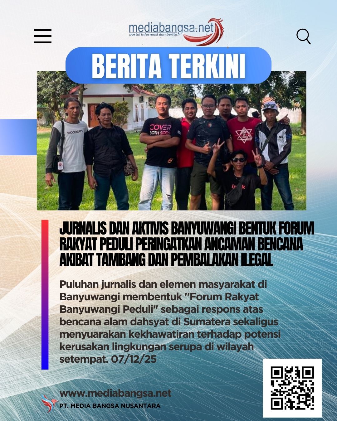Banyuwangi.mediabangsa.net// Puluhan jurnalis dan elemen masyarakat di Banyuwangi membentuk "Forum Rakyat Banyuwangi Peduli" sebagai respons atas bencana alam dahsyat di Sumatera sekaligus menyuarakan kekhawatiran terhadap potensi kerusakan lingkungan serupa di wilayah setempat. Forum ini berkomitmen mengawal isu pembalakan liar dan penambangan ilegal, serta mendukung penuh upaya aparat penegak hukum memberantas praktik terlarang tersebut.