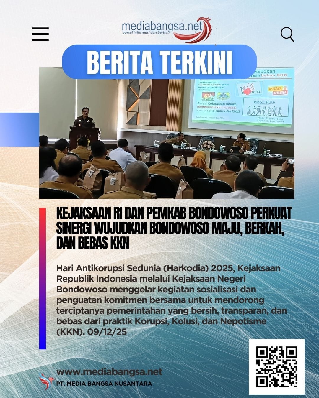 Bondowoso.mediabangsa.net// Dalam rangka memperingati Hari Antikorupsi Sedunia (Harkodia) 2025, Kejaksaan Republik Indonesia melalui Kejaksaan Negeri Bondowoso menggelar kegiatan sosialisasi dan penguatan komitmen bersama untuk mendorong terciptanya pemerintahan yang bersih, transparan, dan bebas dari praktik Korupsi, Kolusi, dan Nepotisme (KKN). Acara ini sekaligus menjadi ruang kolaborasi antara aparat penegak hukum dan Pemerintah Kabupaten Bondowoso dalam mewujudkan Bondowoso Maju, Berkah, dan bebas dari tindak pidana korupsi. Selasa, (09/12/2025).