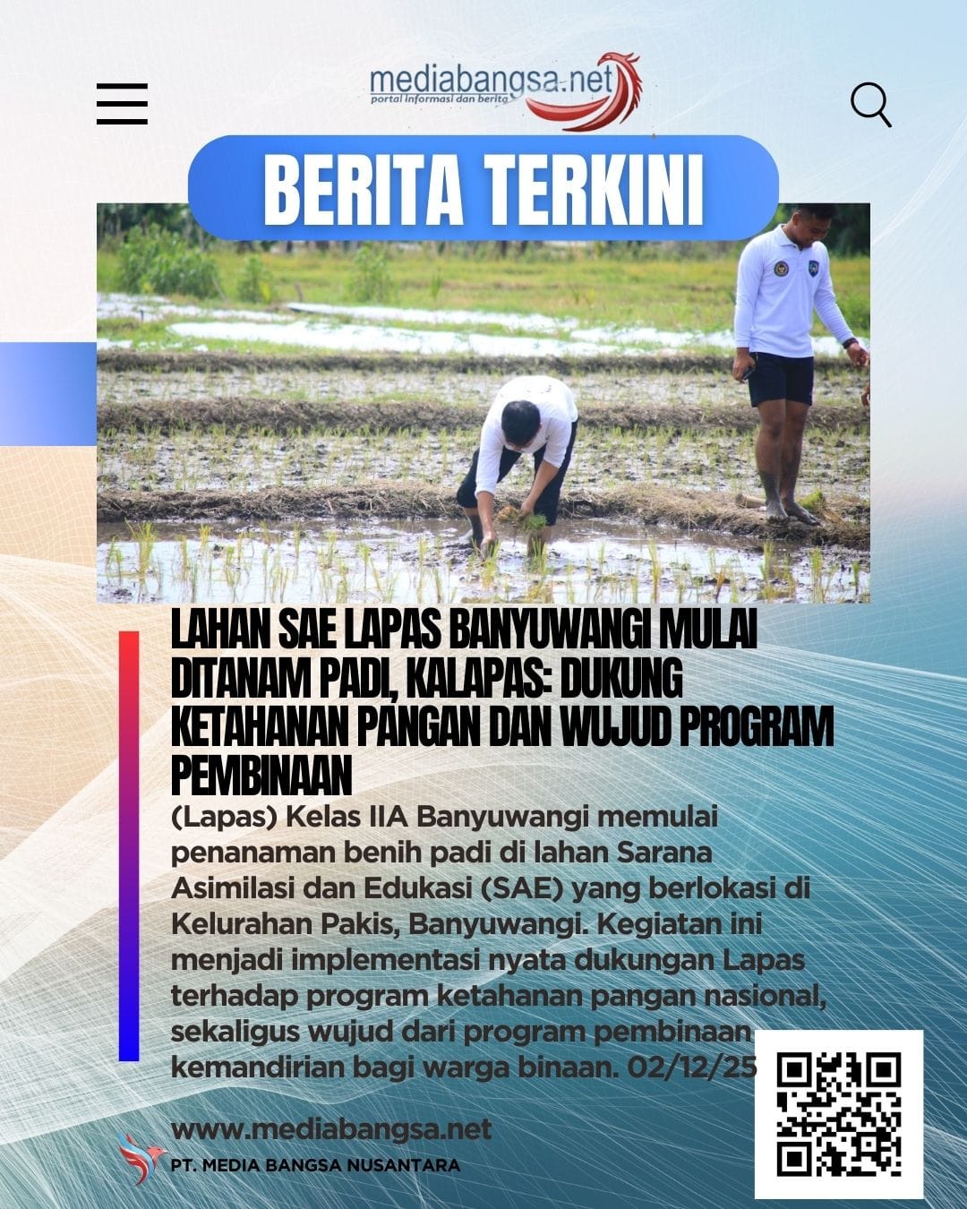 Banyuwangi.mediabangsa.net// Lembaga Pemasyarakatan (Lapas) Kelas IIA Banyuwangi memulai penanaman benih padi di lahan Sarana Asimilasi dan Edukasi (SAE) yang berlokasi di Kelurahan Pakis, Banyuwangi. Kegiatan ini menjadi implementasi nyata dukungan Lapas terhadap program ketahanan pangan nasional, sekaligus wujud dari program pembinaan kemandirian bagi warga binaan. Selasa, (02/12/2025).