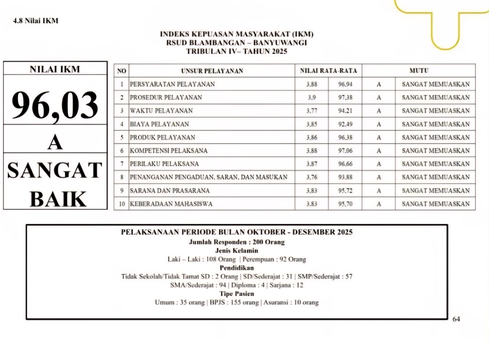Banyuwangi.mediabangsa.net// Rumah Sakit Umum Daerah (RSUD) Blambangan terus membuktikan komitmennya memberikan pelayanan prima bagi masyarakat Banyuwangi. Berdasarkan laporan Indeks Kepuasan Masyarakat (IKM) Triwulan IV (Oktober–Desember 2025), RSUD Blambangan mencatat skor kumulatif 96,03, menempatkannya di kategori mutu pelayanan "A" dengan predikat "Sangat Baik". Selasa, (24/02/2026).