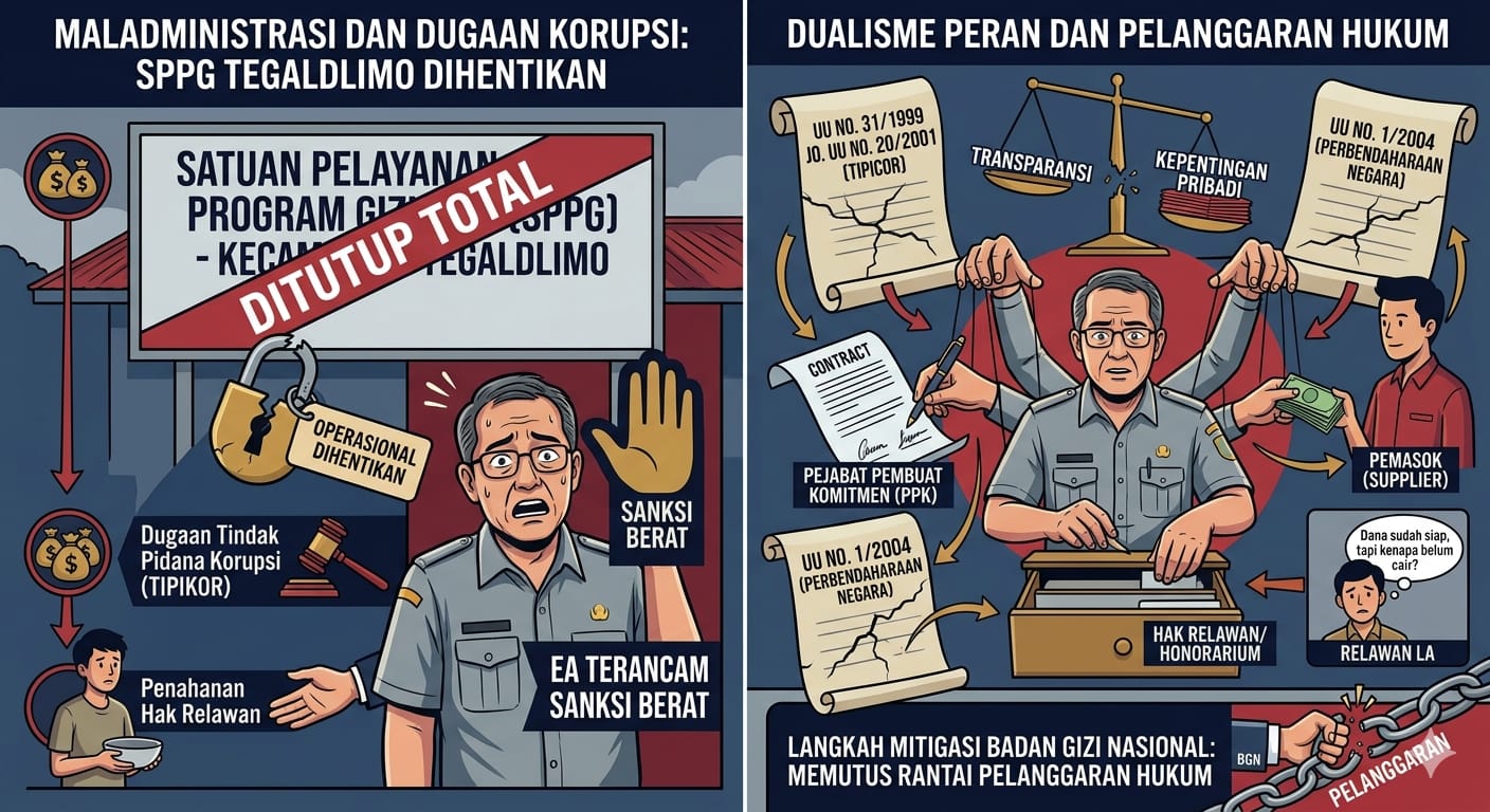 Banyuwangi.mediabangsa.net// Praktik tata kelola keuangan dan manajerial pada Satuan Pelayanan Program Gizi (SPPG) di salah satu kecamatan di Kabupaten Banyuwangi tepatnya di kecamatan tegaldlimo banyuwangi. Situasi saat ini berujung pada penghentian operasional total. Kepala SPPG berinisial EA diduga kuat melakukan pelanggaran berat terkait dualisme peran yang menjurus pada tindak pidana korupsi serta penahanan hak normatif tenaga relawan.