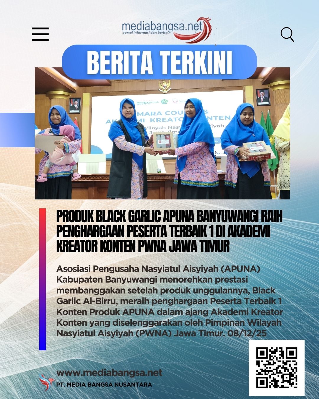 Banyuwangi.mediabangsa.net// 8 Desember 2025 – Asosiasi Pengusaha Nasyiatul Aisyiyah (APUNA) Kabupaten Banyuwangi menorehkan prestasi membanggakan setelah produk unggulannya, Black Garlic Al-Birru, meraih penghargaan Peserta Terbaik 1 Konten Produk APUNA dalam ajang Akademi Kreator Konten yang diselenggarakan oleh Pimpinan Wilayah Nasyiatul Aisyiyah (PWNA) Jawa Timur.