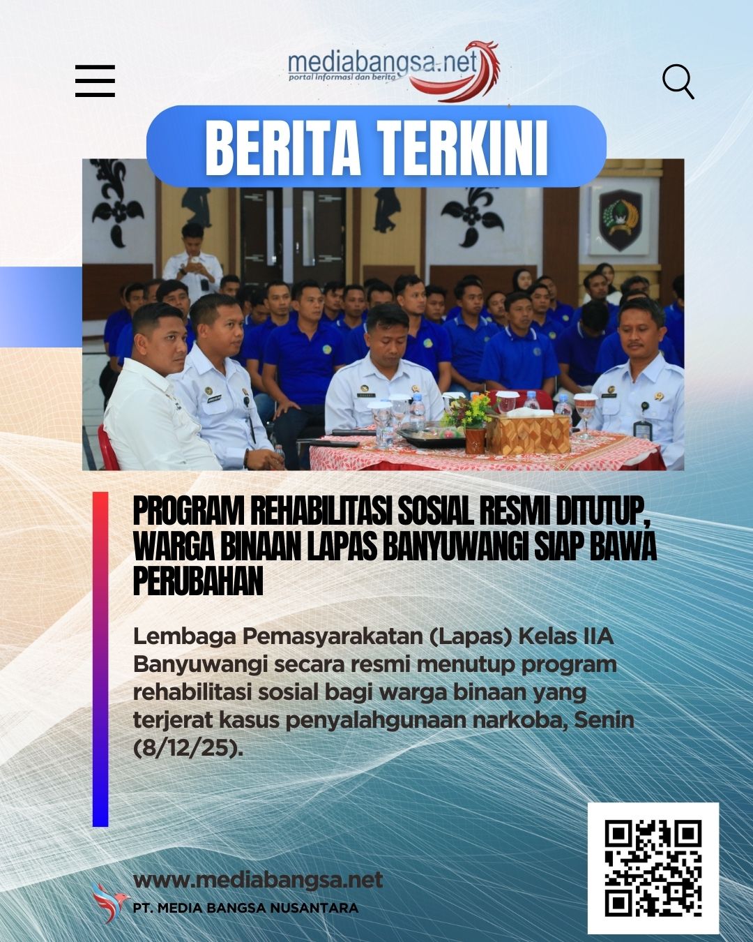 Banyuwangi.mediabangsa.net// Lembaga Pemasyarakatan (Lapas) Kelas IIA Banyuwangi secara resmi menutup program rehabilitasi sosial bagi warga binaan yang terjerat kasus penyalahgunaan narkoba, Senin (8/12). Penutupan program ini menandai kesiapan puluhan warga binaan untuk membawa perubahan positif setelah menjalani serangkaian kegiatan yang intensif.