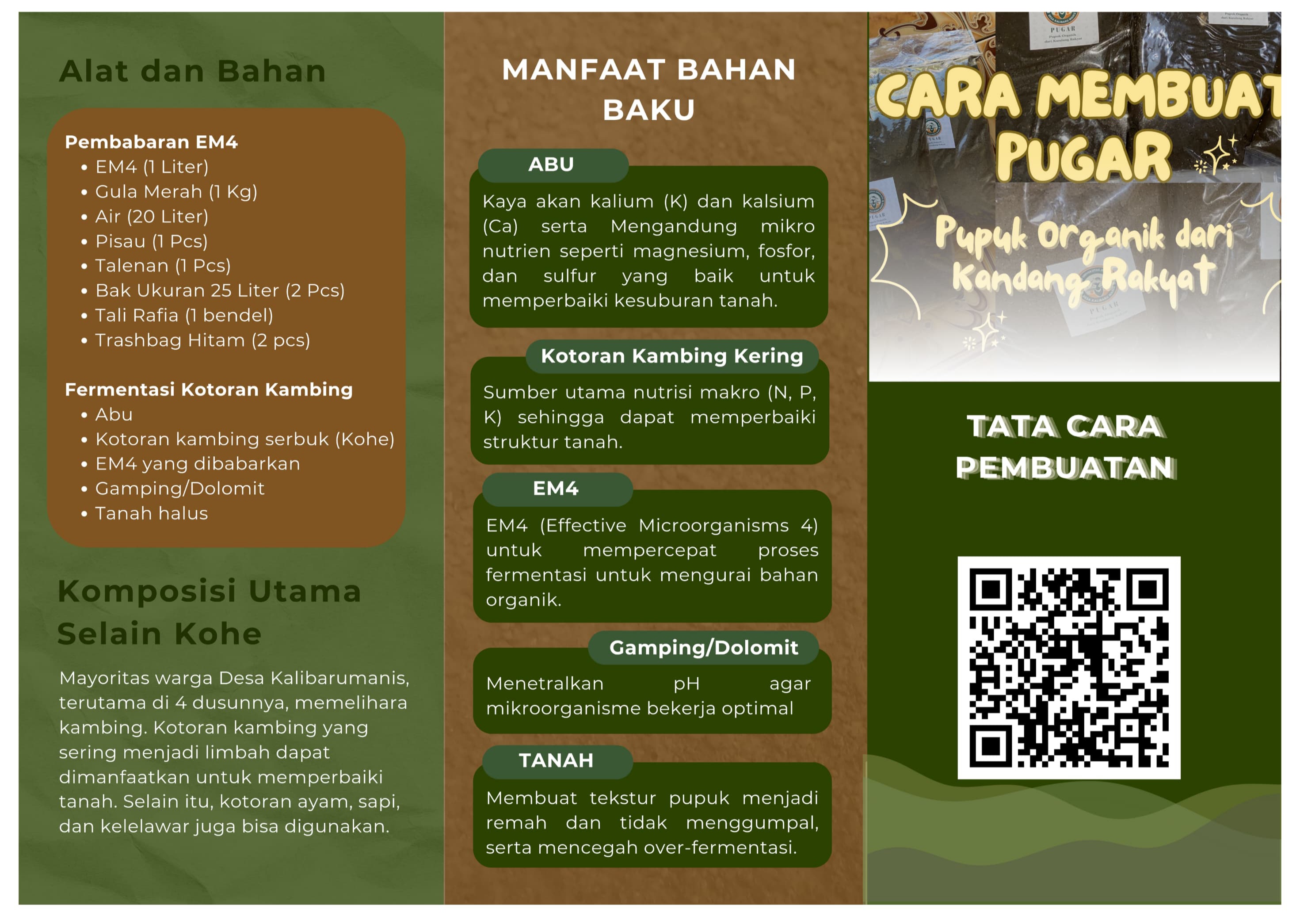 Ketua Tim KKN Kalibarumanis, Ambarwati Dewi Kusumah, menjelaskan bahwa PUGAR diinisiasi sebagai solusi ganda: mengatasi masalah kesuburan tanah sekaligus memanfaatkan keberlimpahan limbah kotoran kambing yang selama ini belum dimanfaatkan secara optimal.